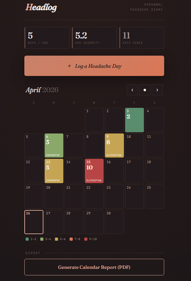 Headlog, designed by Dr. Fred Cohen, makes the logging part fast. Tap a day on the calendar, set the severity, note the medication you took, add any details worth remembering. When it's time for your appointment, download the report and upload it through your patient portal. Use Headlog, use a paper journal, use the notes app — whatever you'll stick with. The tracking is what matters.